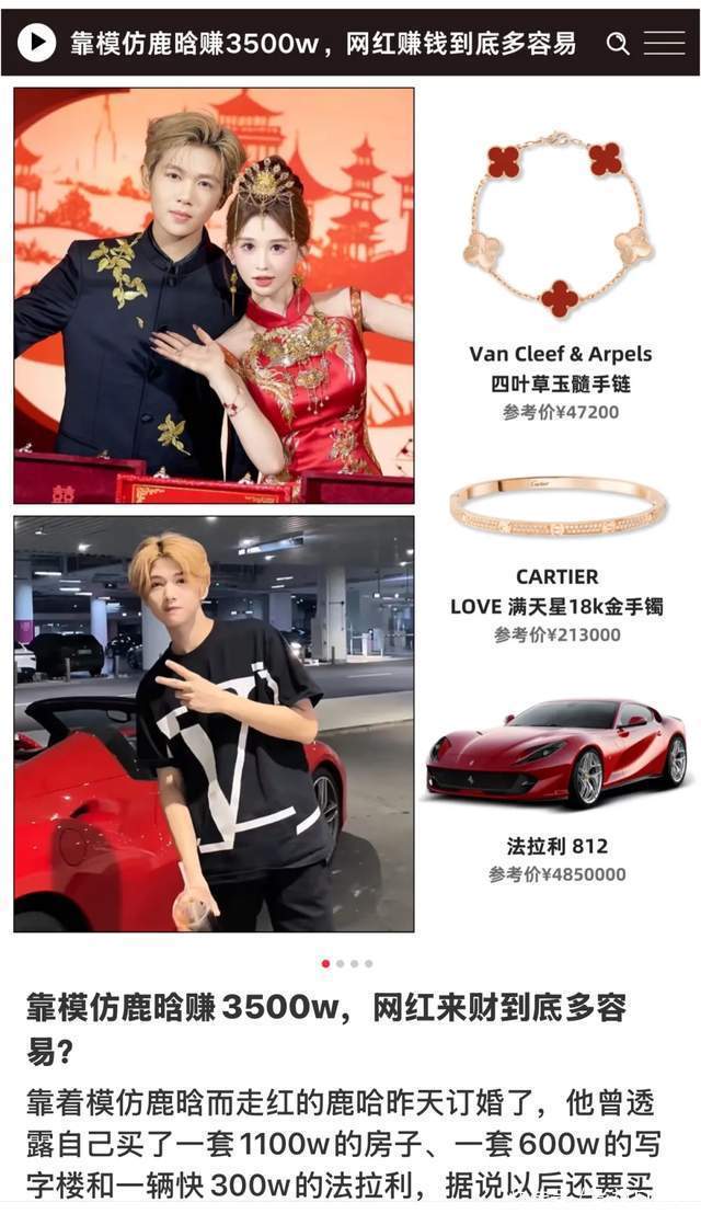 这种网红能活能够赚到钱,就是因为有着相似的面庞和故意恶搞的名字,怎么可能轻易放弃这个摇钱树。鹿哈本人都已经在直播间亲口承认他七个月赚了3500万,平均每个月月收500万,开着四百多万的法拉利住着上千万的豪宅。