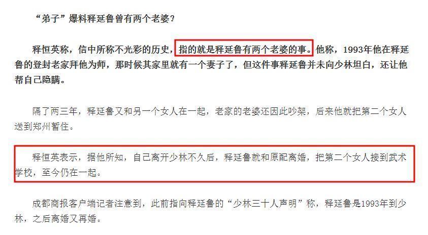 当时释延鲁的弟子还爆料说,1993年的时候释延鲁在老家就有了妻子,当时还要求徒弟向少林寺隐瞒。