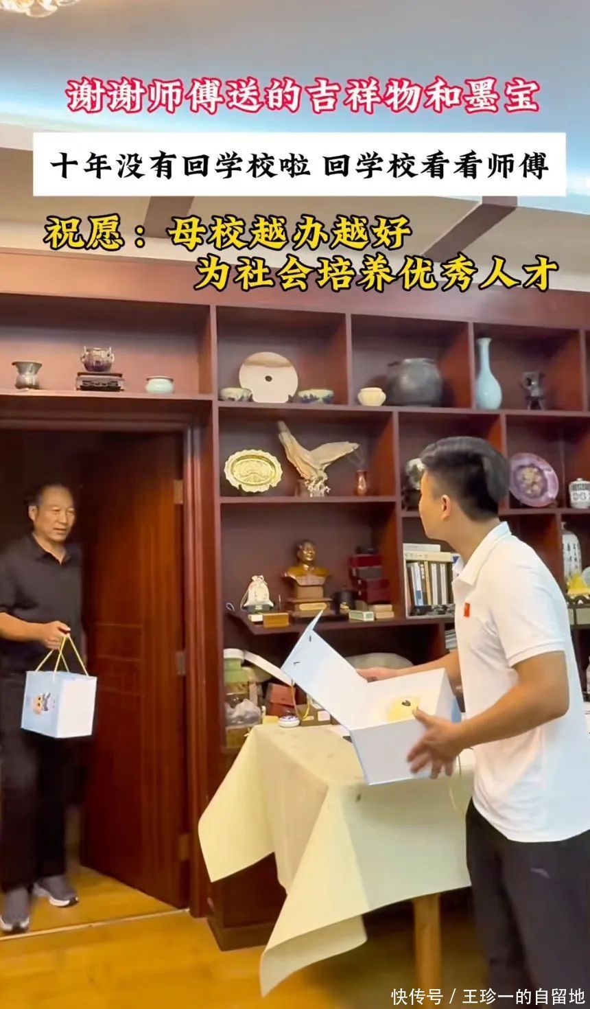从视频中可以看到见到曾经的学生,释延鲁非常高兴,他不是送礼物,就是送书法作品。